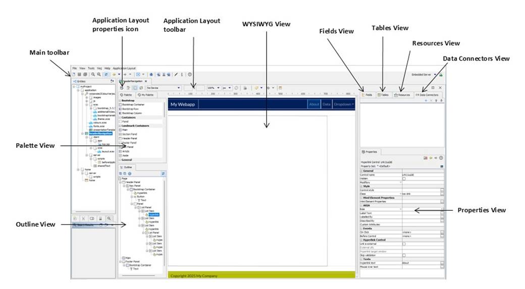 The Application Layout editor consists of a number of panels