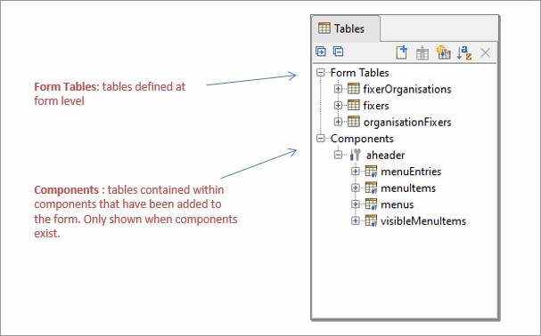 In the Form Editor, Tables are added and maintained in the Tables View.