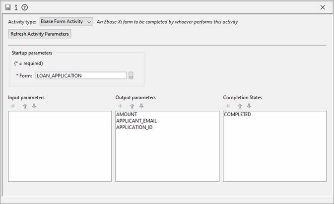 Depending on the activity type selected, the rest of the activity dialog will change to reflect the startup parameters as defined in the activity type. For more details on creating new activity types, see Workflow Customization. Values should be provided for all startup parameters indicated as mandatory.